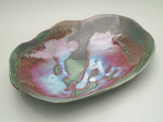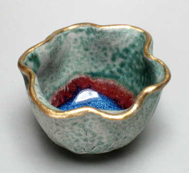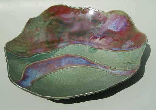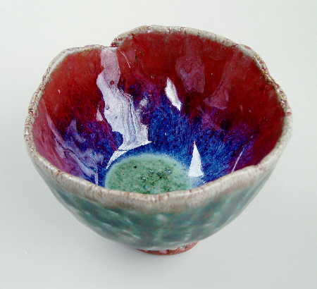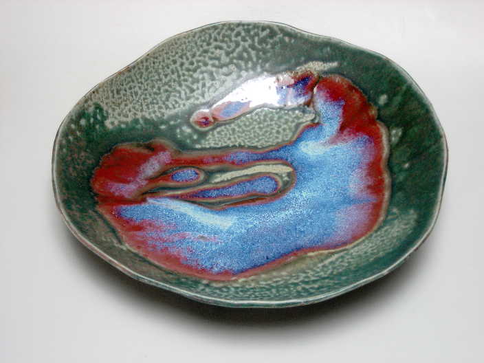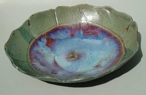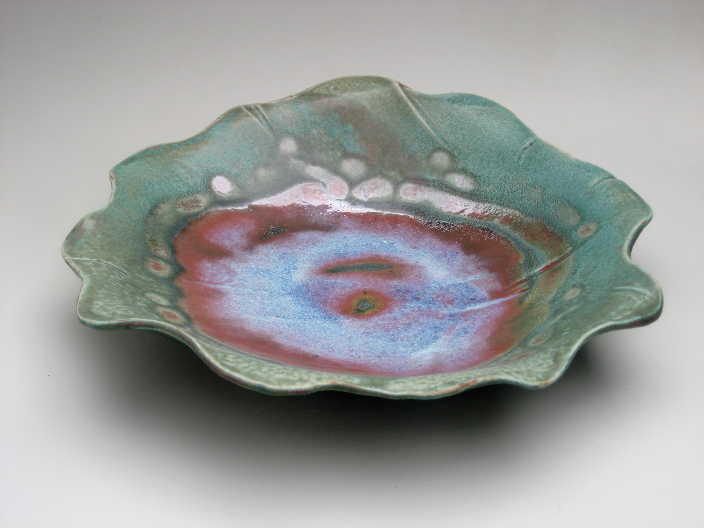 Starting with a simple draped slab of clay, I sculpt the edges, adding folds and incising to give the piece form and depth. Sometimes I'll then carve into the clay to direct the flow of glaze during the firing, other times I'll apply the glaze to take advantage of the natural form of the pot, resulting in a varigated pool of color. The smaller pieces originate from the humble pinch pot, formed from a ball of clay in the palms of my hands. It is a meditative process, filled with spirit.