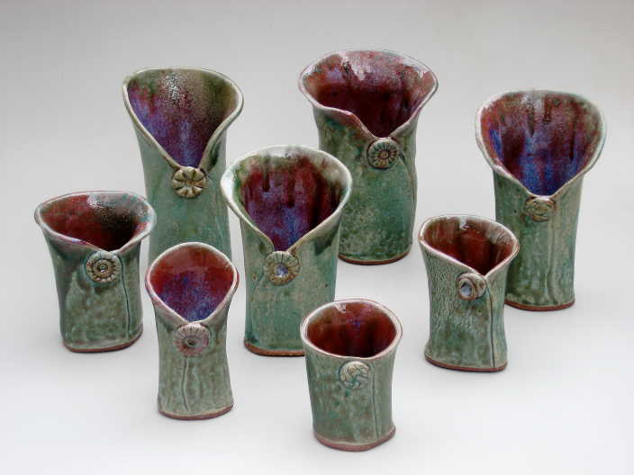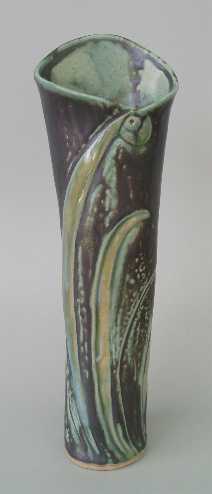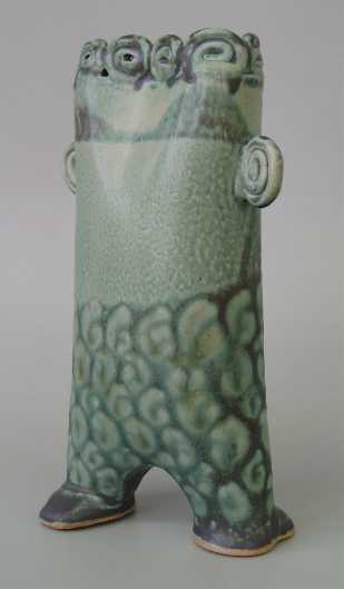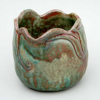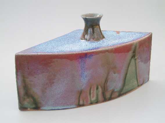 My sculptural pieces cover a range, utilizing both negative and positive spaces. Often they are geometric vessels made from slabs of clay, joined when leather-hard to form well defined lines. Other vessels are more curvaceous and organic. In either case, I may use carvings, bas-relief, and wheel thrown additions to finish the form.